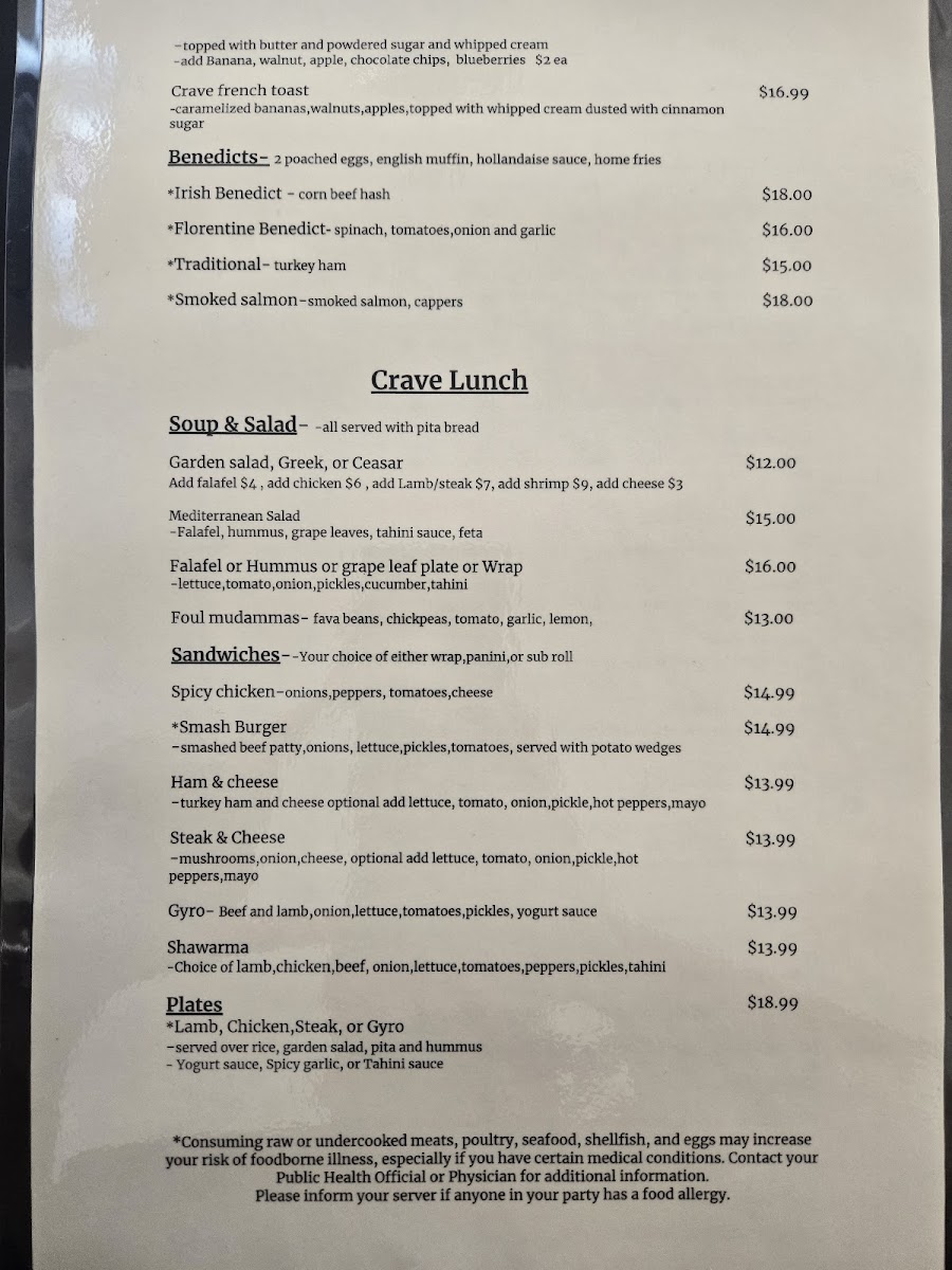 For food, the menu highlights a range of Benedicts, including Traditional Benedict, Florentine Benedict, Irish Benedict, and Smoked Salmon Benedict. These dishes serve as main course options that combine classic breakfast ingredients. Additional items such as bagels and calzones are also featured, supporting a diverse offering of light and more filling choices.